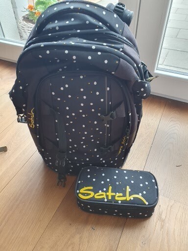 schwarzer Schulrucksack weiss gepunktet von Satch; inkl. Etui; in sehr gutem Zustand.