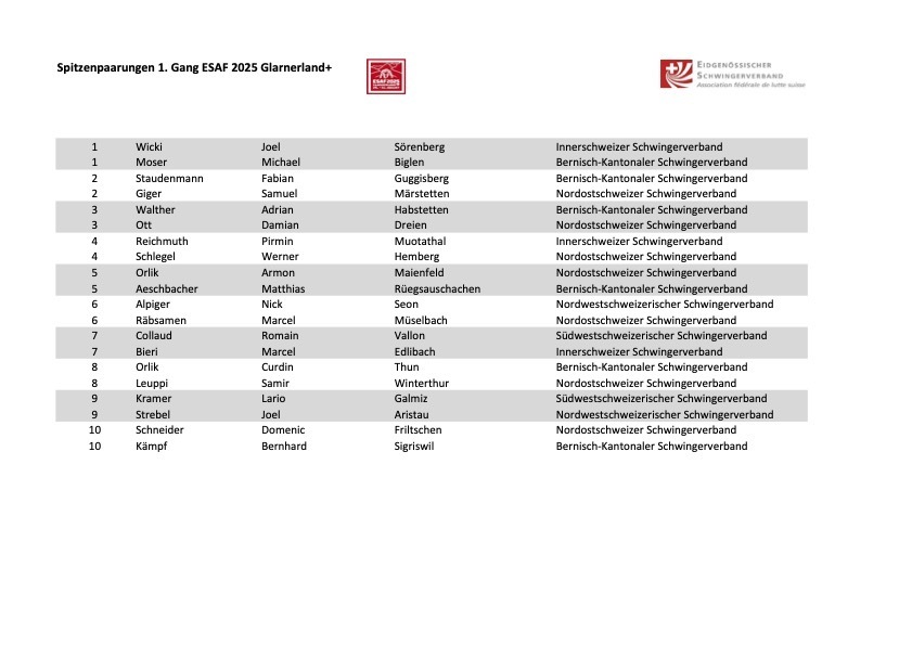 Am Mittwochabend hat Stefan Strebel vom Eidgenössischen Schwingerverband bekanntgegeben, wie er die stärksten Schwinger ins ESAF starten lässt. Adrian Walther schwingt am Samstagmorgen gegen den Nordostschweizer Damian Ott, Michael Moser bekommt den Innerschweizer Schwingerkönig Joel Wicki.