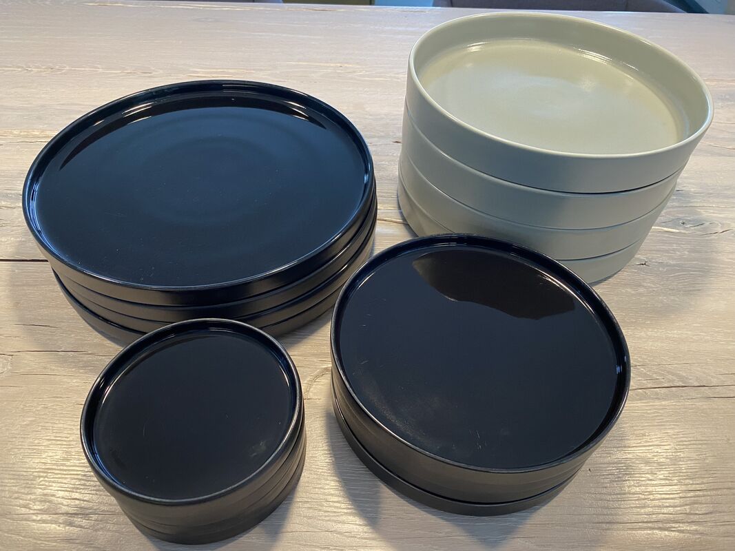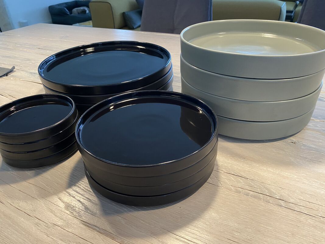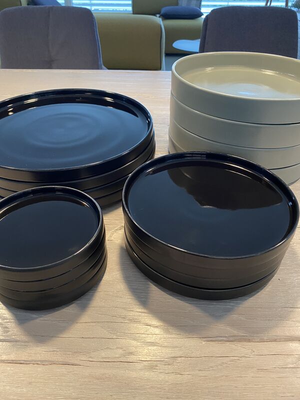 Die schwarzen Teller sind aussen matt, innen glänzend und bringen etwas Lebendigkeit auf dem gedeckten Tisch, insbesondere in Kombi mit mattem Geschirr. Lindengrüne Teller sind innen und aussen matt.