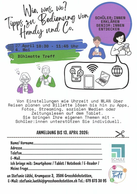 Schülerinnen und Schüler helfen Senioren beim Gebrauch von Handys und andern Geräten.