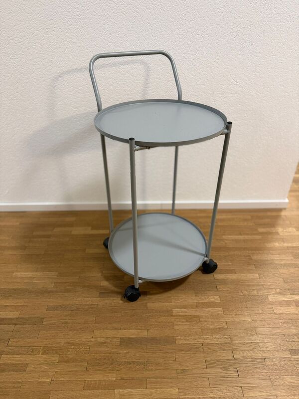Ein kleiner blauer Tisch auf Rollen