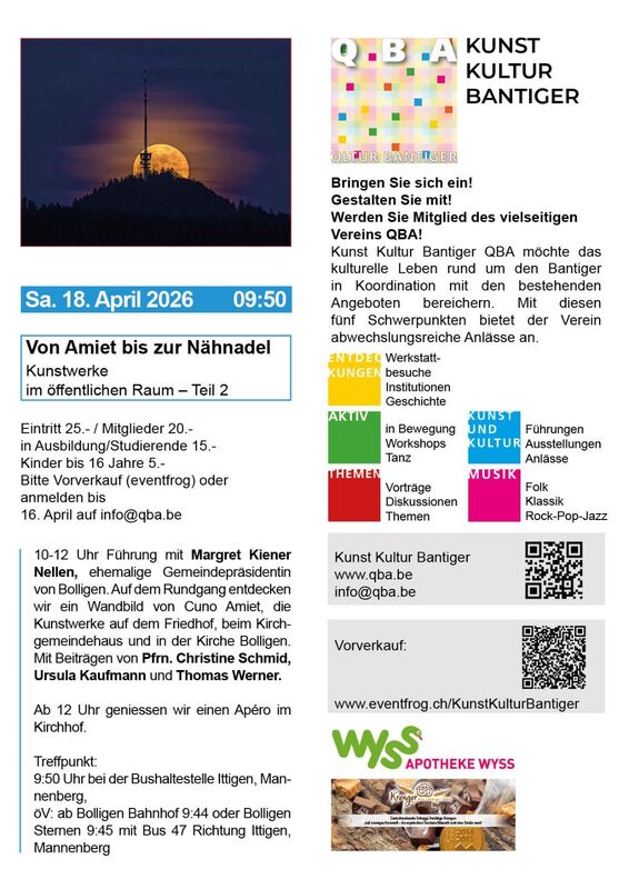 10 bis 12 Uhr Führung mit Margret Kiener Nellen, ehemalige Gemeindepräsidentin Bolligen. Auf einem Rundgang entdecken wir ein Wandbild von Cuno Amiet, die Kunstwerke auf dem Friedhof, beim Kirchgemeindehaus und in der Kirche Bolligen. Mit Beiträgen von Pfrn. Christine Schmid, Ursula Kaufmann und Thomas Werner.