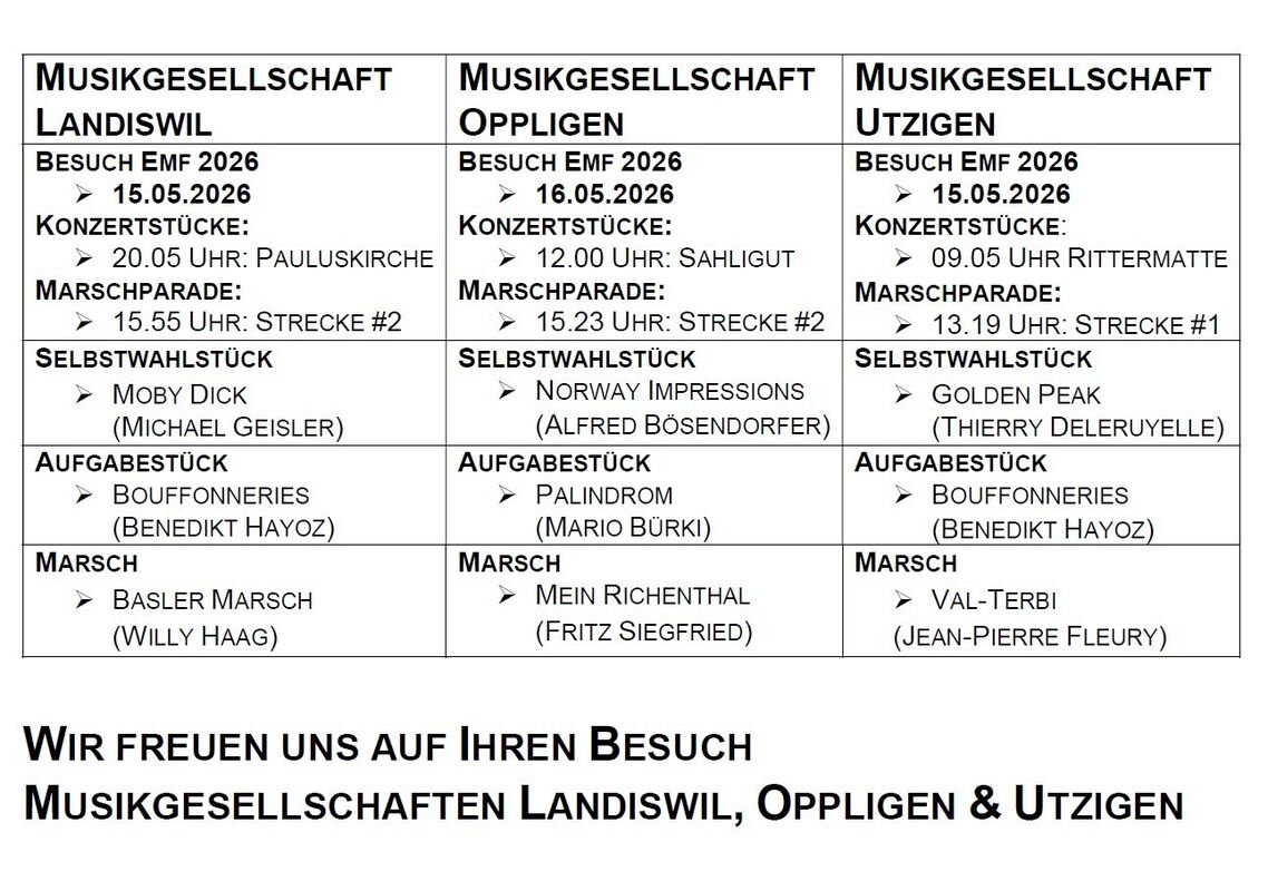 Die Musikantinnen und Musikanten der Gesellschaften Landiswil, Utzigen und Oppligen bereiten sich mit grossem Engagement und viel Freude auf das EMF 2026 in Biel vor. In intensiver Probenarbeit wird am Aufgaben- und Selbstwahlstück gefeilt, um das Publikum und die Jury gleichermassen zu begeistern.