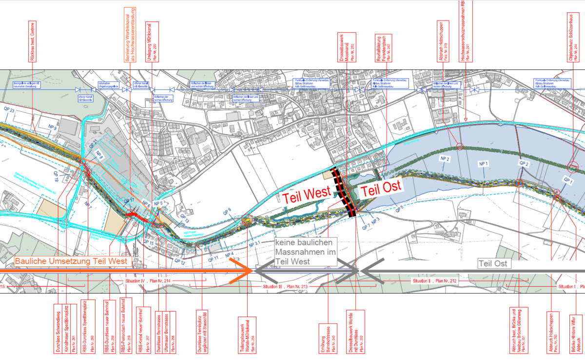 Vorrang hat der Plan West aus zweierlei Gründen: Gegen diesen Teil waren weit weniger Einsprachen eingegangen, und diese sind offenbar einfacher zu bereinigen. Zentrale Punkte dort sind Mühlekanal und Worblekanal: Sie sollen als Hochwasserschutzmassnahme dauerhaft geöffnet bleiben. «Zusammen mit dem geplanten Umgehungsgerinne ergibt das aus heutiger Sicht einen guten Hochwasserschutz», findet Christian Kaderli nach gründlicher Prüfung.
