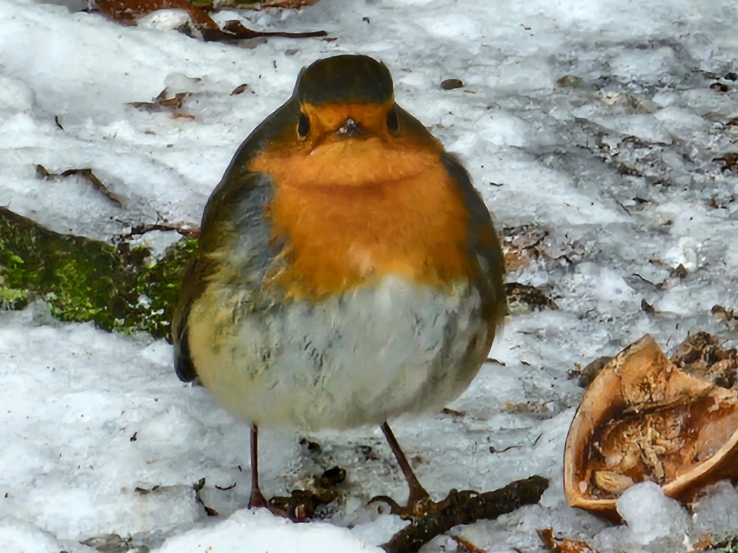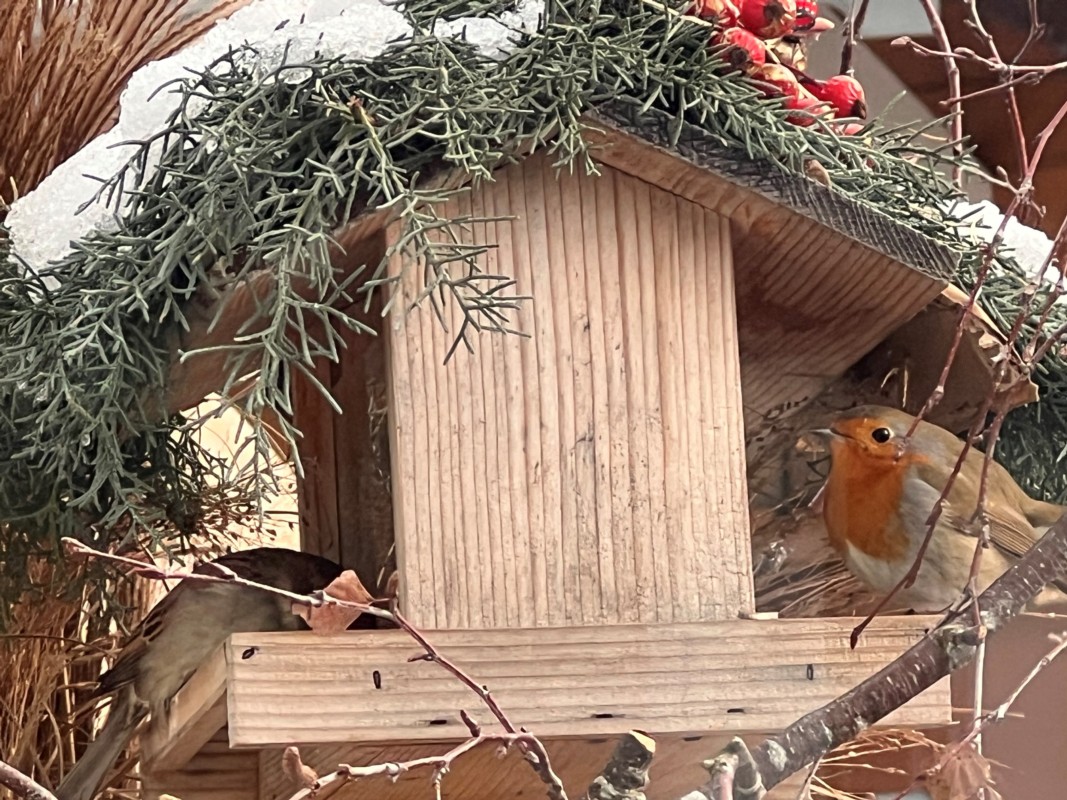 Wer jetzt ein Vogelhaus auf dem Balkon hat, kann dort ab und zu auch den Vogel des Jahres 2025 beobachten. Das Rotbrüstchen, wie er in der Schweiz liebevoll genannt wird, mischt sich oft unter die Meisen und nascht gerne mit. Es ist wohl einer der Vögel, den Kinder als erstes kennen lernen. Dank seiner orangen Brust ist das Rotkehlchen leicht zu erkennen.