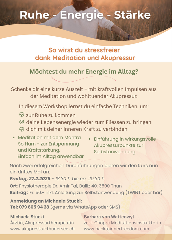 Mit Michaela Stucki, Ärztin und Akurpessurtherapeutin, Hünibach + Barbara von Wattenwyl, zert. Chopra Meditationsinstruktorin /Hypnosetherapeutin VSH/NGH, Worb