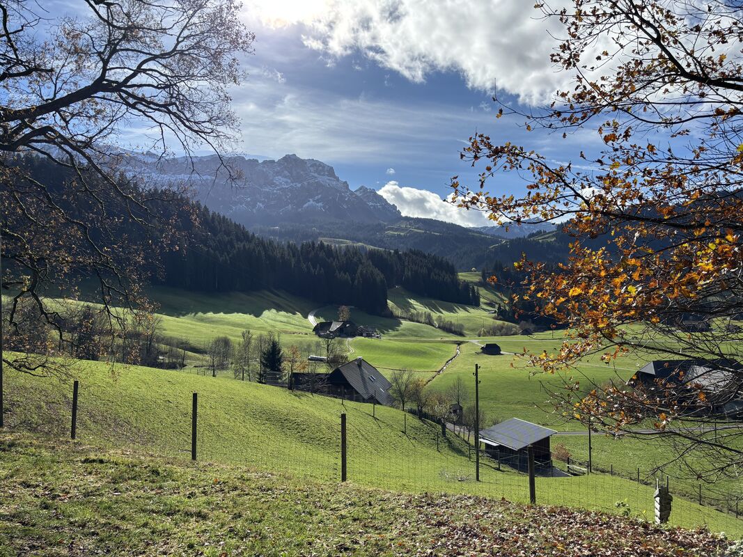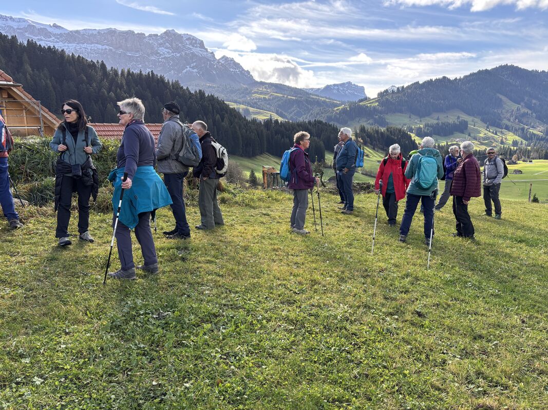 Weiter gings bis an den Waldrand im Grünenwaldmoos. Dieser Name spricht für sich: Die saftig-grünen Wiesen, die bunten Wälder und der blaue Himmel mit der wärmenden Herbstsonne luden zur Mittagsrast ein. Dabei konnten alle auch die Aussicht auf das Grünhorn, die Sichle, den Hohgant, die Schratte und die Rischibodenfluh geniessen.