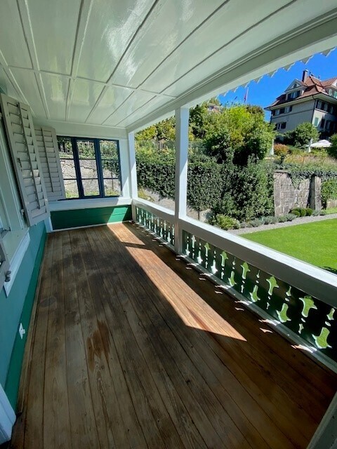 - grosser gedeckter Balkon und verglaste Veranda mit Aussicht in schöne Gartenanlage