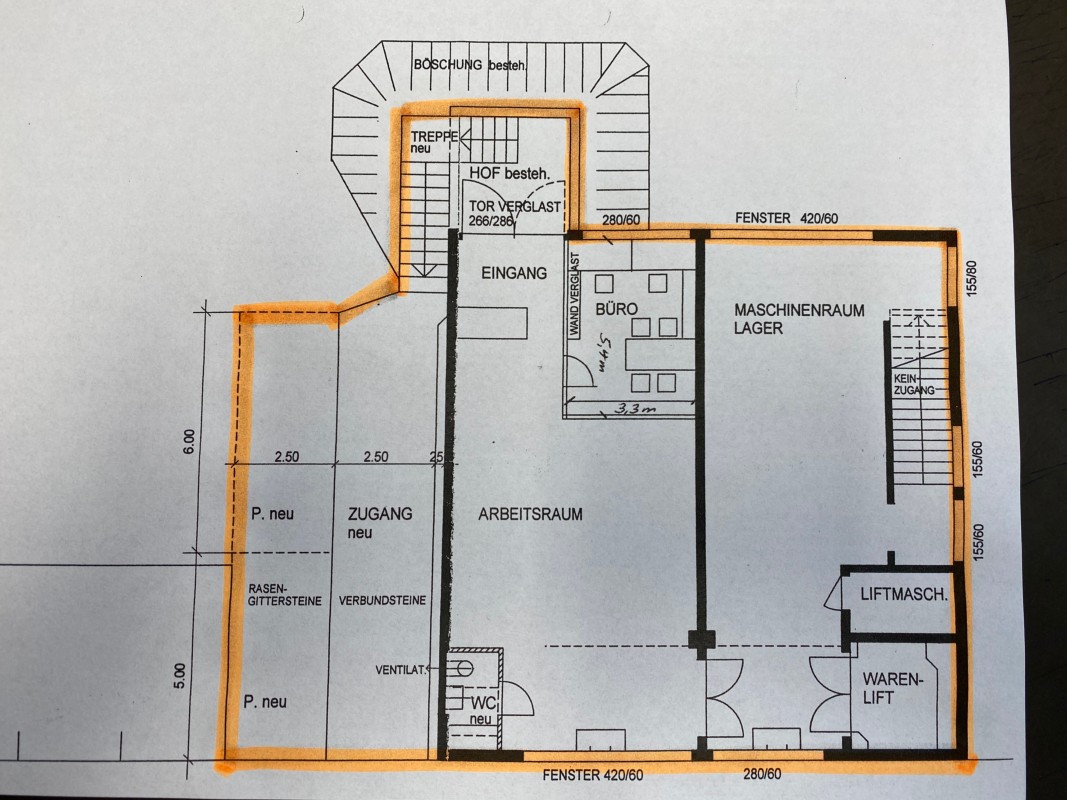 Untergeschoss ca. 160 m2 BF/ 145 m2 NF (L: 12,7 m, B: 12,4 m, H: 3,06 m) mit abgetrenntem Büroraum (3,3 m x 5,4 m) (Glasfaseranschluss vorhanden), mit Oblichtern, WC, mit Warenlift zum EG (Traglast 1000 kg).