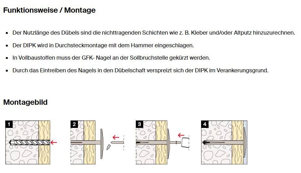 Der fischer Schlagdübel DIPK ist ideal, um druckfeste Dämmstoffe bis 160 mm Dicke wie Polystyrolplatten, Holzwolle-Leichtbauplatten und PU-Hartschaumplatten in Beton, Voll- und Lochstein sicher zu befestigen. Bei der Verwendung in Vollbaustoffen ist der GFK-Nagel an der verjüngten Sollbruchstelle zu kürzen. Der Schlagdübel DIPK besteht aus einer weißen Dübelhülse mit angeformtem Teller und einem glasfaserverstärkten Kunststoffnagel. Der DIPK wird mit dem Hammer eingeschlagen. Dies spart Zeit und Kosten. Der glasfaserverstärkte Kunststoff-Nagel reduziert die Transmissionswärme und verhindert Abzeichnungen an der Putzoberfläche.