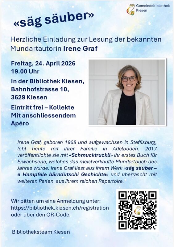 Wir bitten um eine Anmeldung unter: https://bibliothek.kiesen.ch/registration oder über den QR-Code.