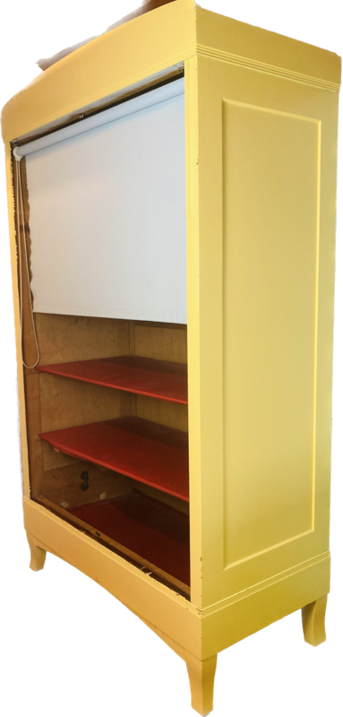 Der gelbe Holzschrank mit hellblauem Rollo ist sehr stabil. Man kann Ihn ohne Werkzeug gut auseinander nehmen ( Drehschrauben).